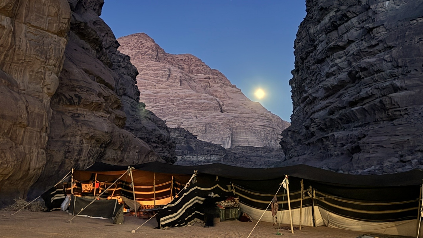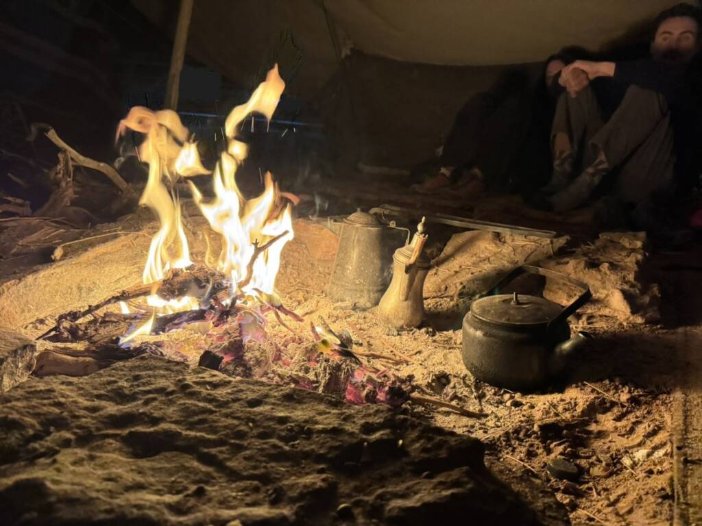 After a day tracing the footsteps of ancient traders, reading the desert’s oldest petroglyphs, and standing in the shadow of Jebel Rum, we do what the Bedouins have done for centuries: We stop, we light a fire, we look up.